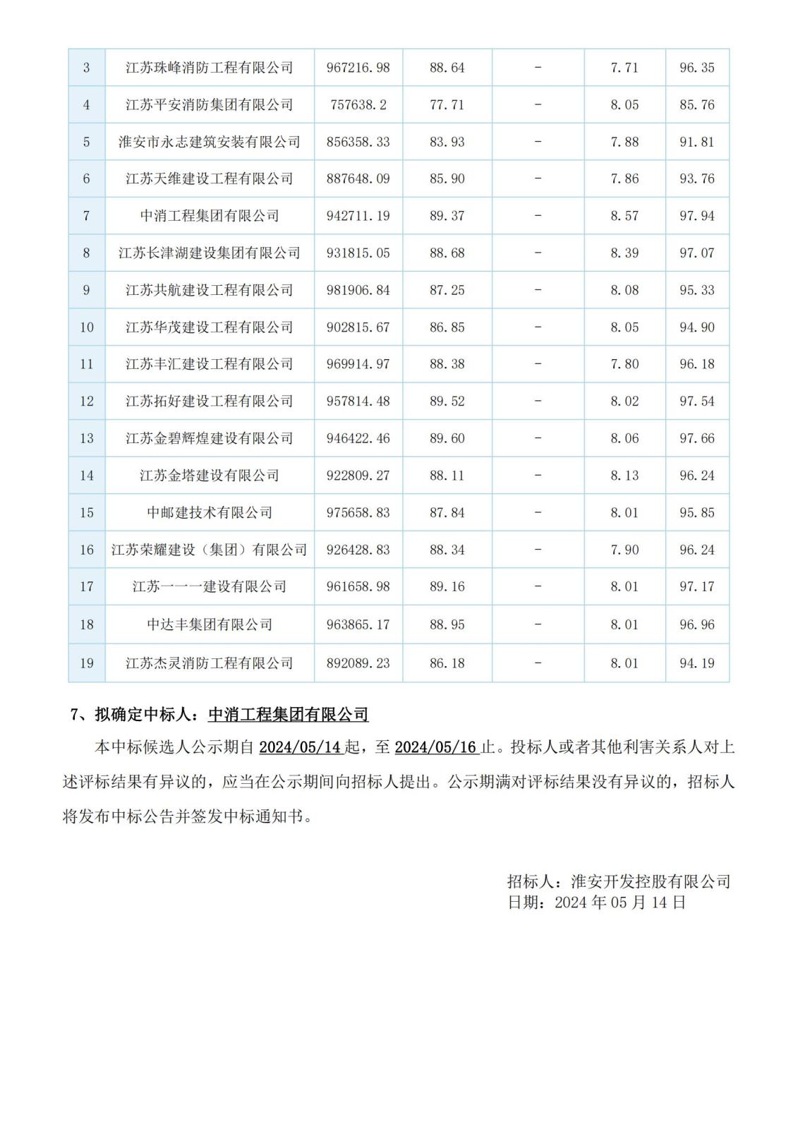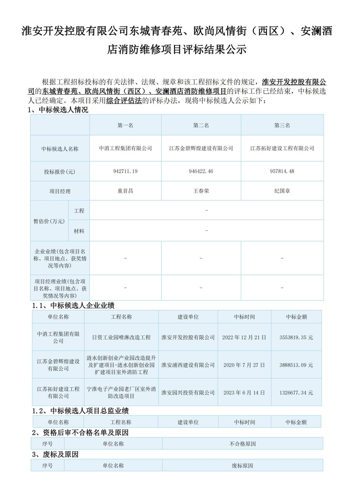 淮安開發(fā)控股有限公司東城青春苑、歐尚風情街(西區(qū))、安瀾酒店消防維修項目評標結果公示